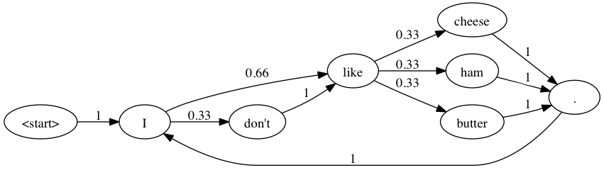 Using Markov chains would allow me to use song lyrics as a training ground for creating alternate phrases. This would consequently form a probability-based flowchart like the one above, allowing me to generate new sentences by walking through each word state and letting probability determine my next word.