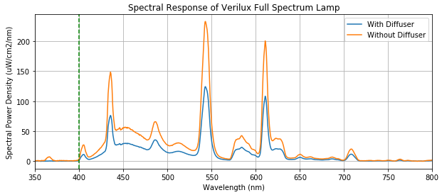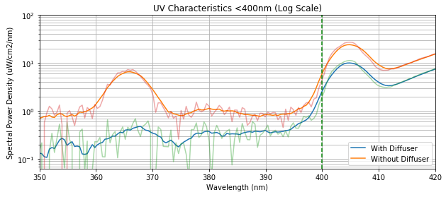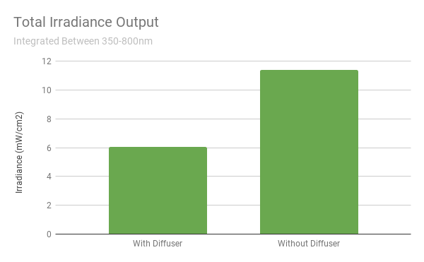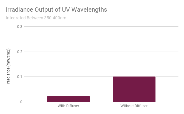 To put a number to this, we can numerically integrate the spectral power density at each wavelength and sum up the values to calculate irradiance (in units mW/cm2). Over the entire measured spectrum of 350 - 800 nm, we see that the diffuser reduces the total brightness by ~48%. So instead of removing just the UV wavelengths, they diffused the entire spectrum until the UV exposure is low enough to meet the “no UV exposure” threshold.