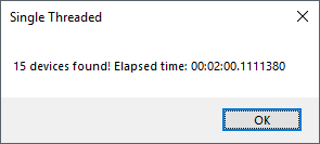 MessageBox.Show(nFound.ToString() + " devices found! Elapsed time: " + ts.ToString(), "Synchronous");