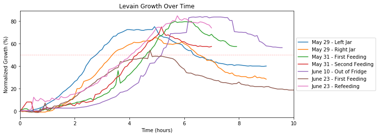On May 29th, we began to feed our sourdough starter after many months of sporadic feeding. With the June 10th growth, the ramp up occured later but eventually rises to ~80%. The ideal growth target is to double or triple in size, but hopefully that time will come with even more regular feeding.