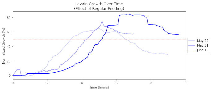 On May 29th, we began to feed our sourdough starter after many months of sporadic feeding. With the June 10th growth, the ramp up occured later but eventually rises to ~80%. The ideal growth target is to double or triple in size, but hopefully that time will come with even more regular feeding.