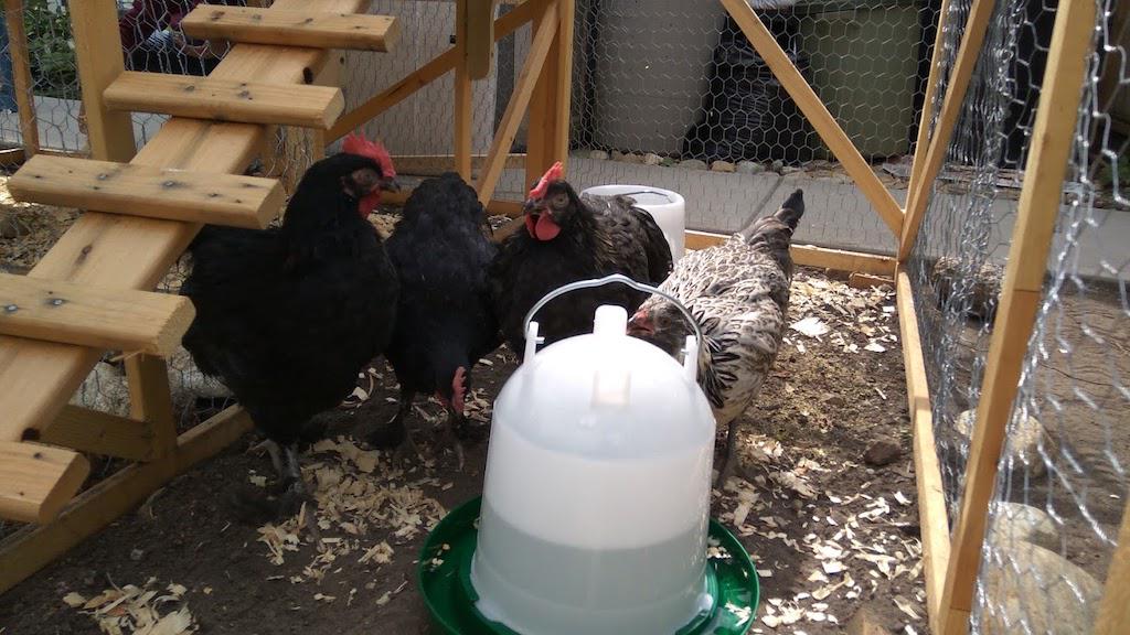 On the first few nights, a bit of training was required to tell the chickens to go inside the coop at dusk. To do this, we shined a flashlight from the inside (such that it’s visible from the outside), which eventually attracted their attention and they flew up into the opening.