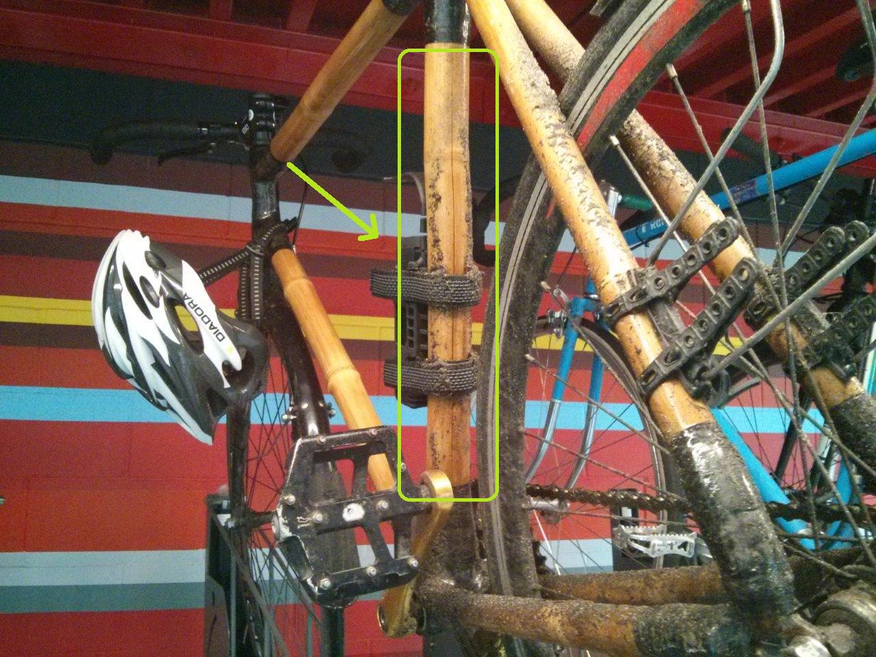 Update: As of May 2017 and no more riding in the rain, the bamboo managed to dry and the split sealed up. The ride is much less spongy/flexy than before, so I think it will now officially become a fair-weather bike.