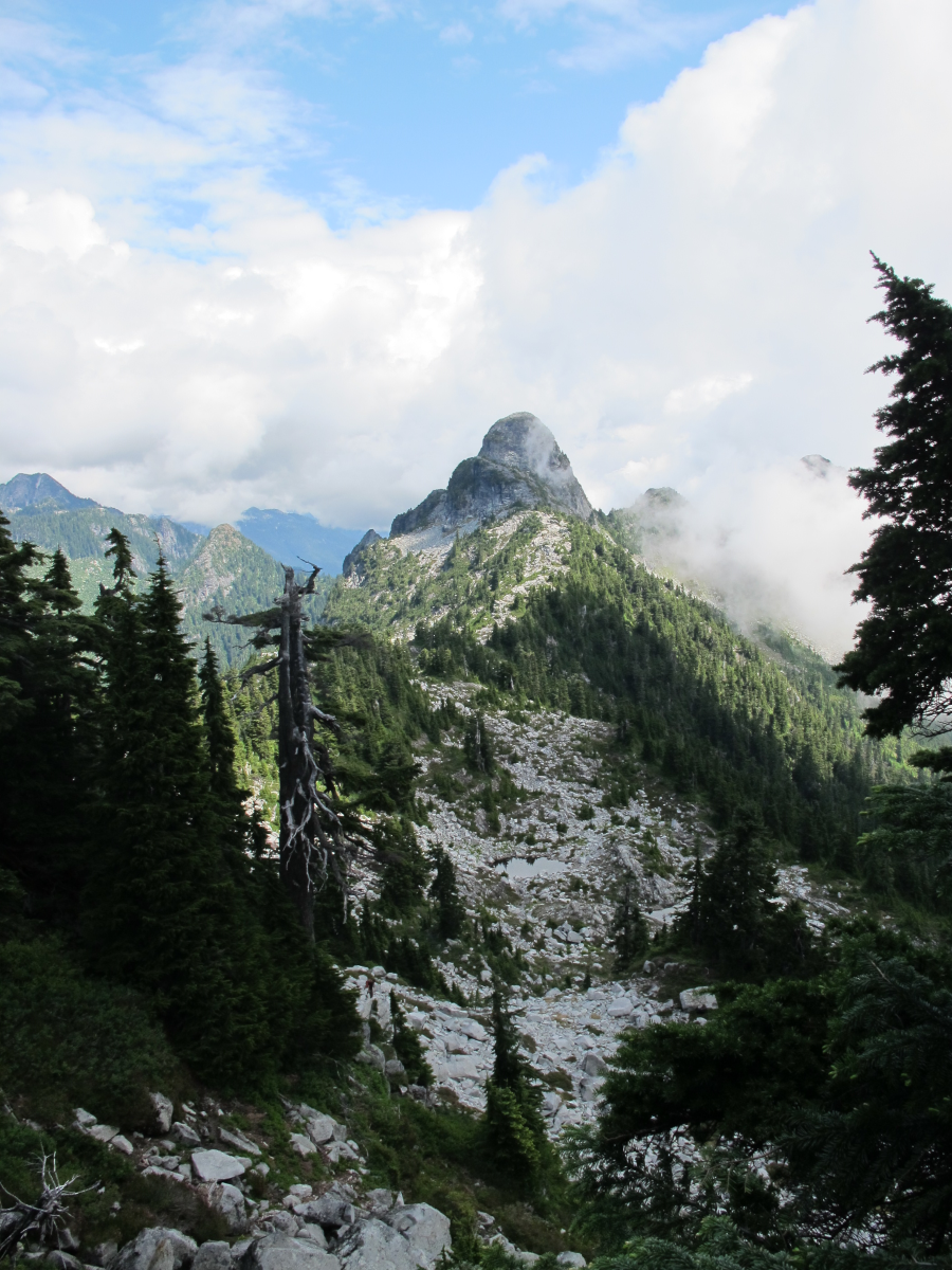 As we continued northward toward Mt. Unnecessary the trail began to narrow and evolve into a slightly trickier, but manageable, beast. The forested area began to thin out, and a couple forehead sweat-wipes later we were hiking out along the mountain ridge. While I was too busy focusing on my footing and trying not to tip over like an inverted pendulum, I hadn’t even noticed how spectacular the view was. Hiking through lush greenery was one thing, but traversing a rocky slab surrounded by an expansive view of the mountains and sea was on a whole different level. We approached a fairly steep climb along the ridge, but with the dry conditions and help of our trusty hiking boots, we didn’t leave anyone at the bottom. A few more sweat-wipes later and we were soaking in the glorious view of Howe Sound. A herd of mildly ominous-looking clouds peered from the east, covering portions of the Lions in the distance. The Weather Network reported a dry, sunny weekend, so why should we have anything to be concerned about? It’s not like they’ve been wrong about the weather in the past…. Did I remember to bring a rain jacket?