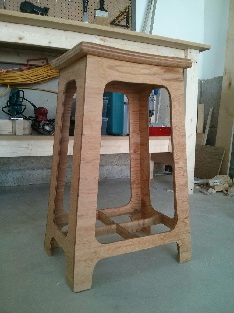 My family moved into a new house, meaning that we finally have an actual garage instead of a measly carport. But what this really means is that I get a chance to claim space to set up an actual workshop! First project was naturally a workbench, which I put together using 2x4’s and a 3/4" MDF board for the work surface (see above). Second project was a bench stool, as shown in the following images below. The builders left some 1/8" plywood in the yard, and I wanted to see how sturdy of a chair I can make with it given the inherent flimsiness of the thin sheet stock. By adding a reinforcing cross-brace at the base of the legs, I was able to significantly increase its sturdiness.