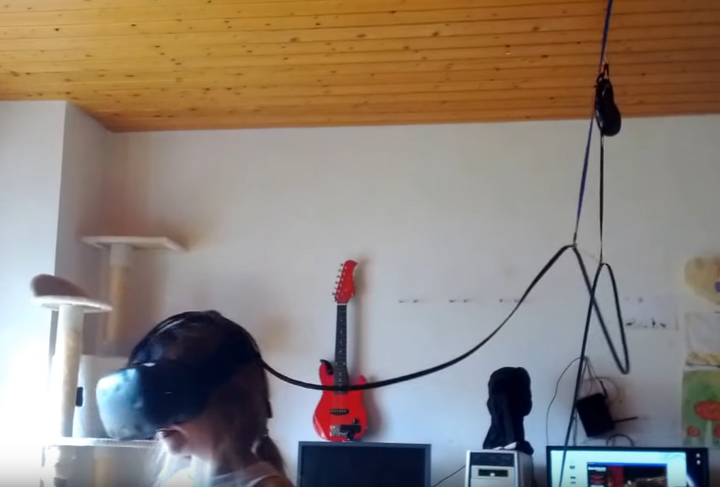 A handful of HTC Vive owners have mounted retractable identification badge fobs or dog leashes to the ceiling to create an overhead holding point of the cable. However, certain player movements will result in tension between the mounting point and the headset. We tried this ourselves, and we found the cable tugging more distracting than having to step over the cable.