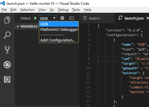 Open the Debug panel (CTRL + SHIFT + D) and select “Add Configuration > GDB” through the top left dropdown arrow. Create a GDB configuration in launch.json and add the following. Note: Change the paths in “target”, “gdbpath”, and “autorun” to the correct locations.