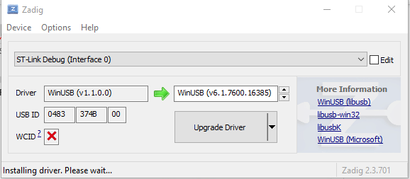 Use Zadig to upgrade ST-Link Debug to the correct WinUSB driver. Enable through Options > List All