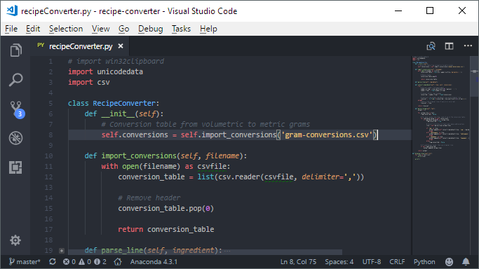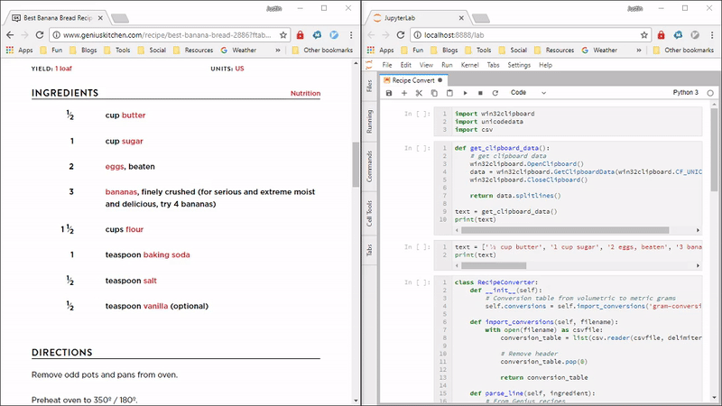 With this in mind, I was tired of constantly typing “1 tbsp baking soda in grams” and “3 1/4 cup flour in grams” into Google every time I came across a new recipe. There had to be a better way, and there was. As usual, Python was staring, patiently waiting for me to make eye contact with it.