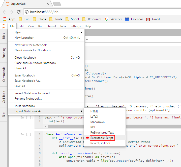 Fortunately, this is painless! In Jupyter, navigate to File > Export Notebook As... > Executable Script, and that’s it. A Python script will download with all the cells in a single executable file.