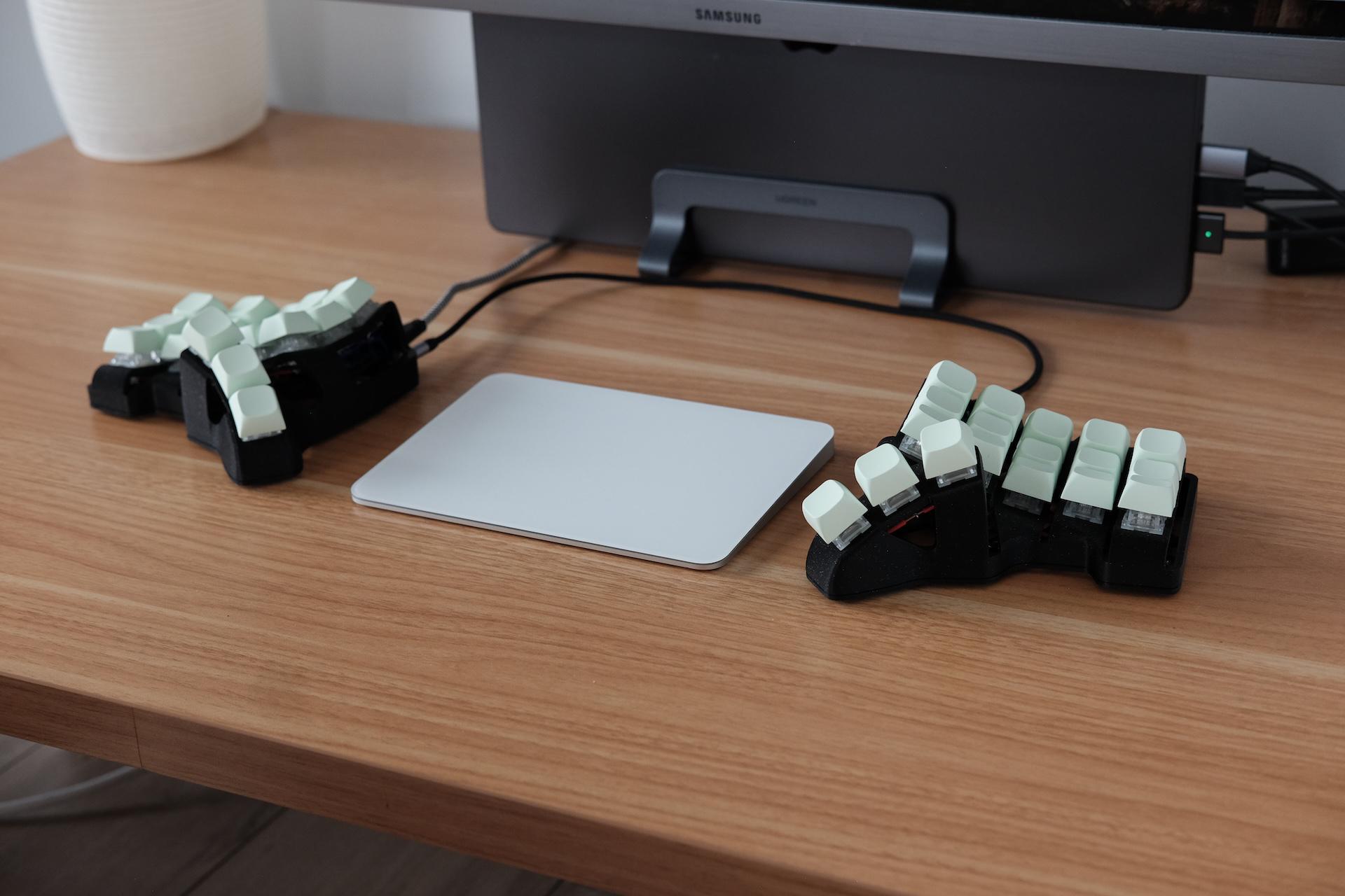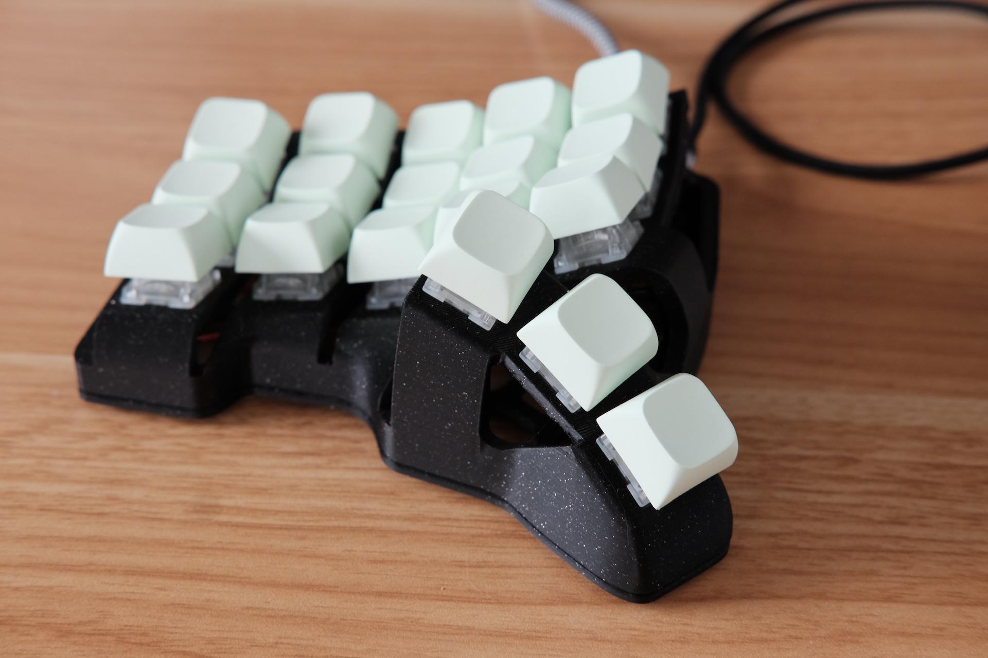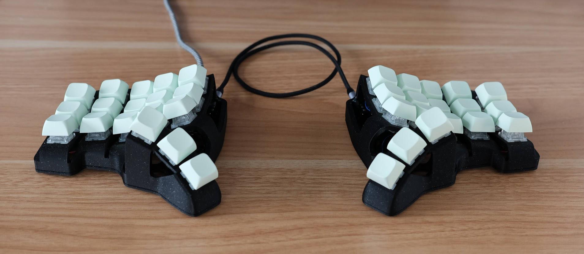 My Corne was a good intro keyboard, but I eventually determined it had more keys than I actually needed. I also grew intrigued towards keyboards with better ergonomics - more stagger and splay to improve alignment with ring and pinky fingers, as well as keyboards with sculpted, organic surfaces to better follow my hand’s natural shape.