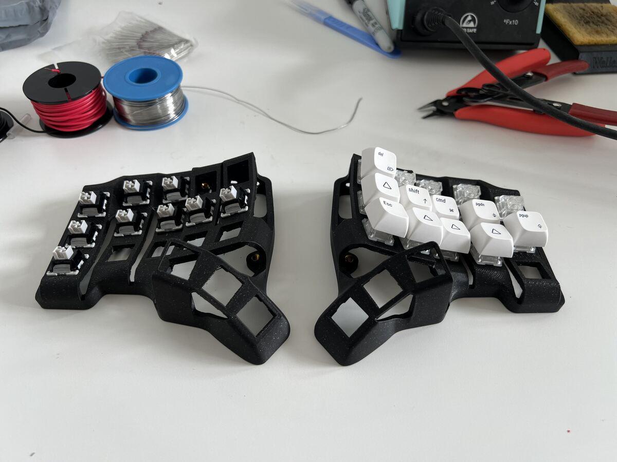 Other keyboards like the Charybdis seemed to be quite popular, but I was searching for something smaller and less bulky looking. I also didn’t want to design my own using Cosmos just yet, since I knew it’d take a few iterations to get right which would be difficult without my own 3D printer.