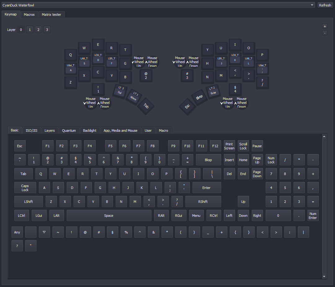 CAPSLOCKtoESCwhen tapped,CTRLwhen held). - Combos : Press two keys to output another. (E.g.