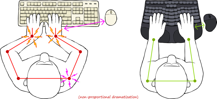 Exaggerated depiction of how a split keyboard can help promote a more neutral, comfortable typing position. (Source: Candid Technology)