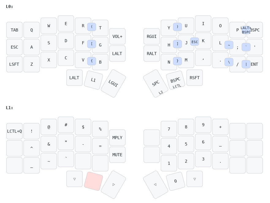 CAPSLOCKtoESCwhen tapped,CTRLwhen held). - Combos : Press two keys to output another. (E.g.