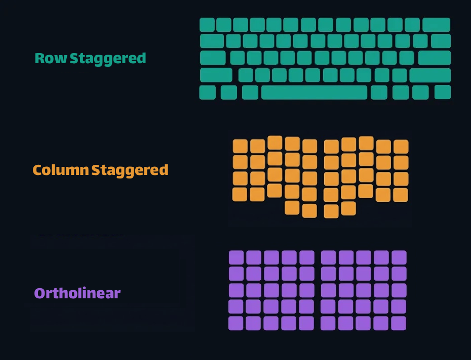 - Ortholinear: Uniform grid, no stagger. Visually pleasing, but less common in ergonomic splits.