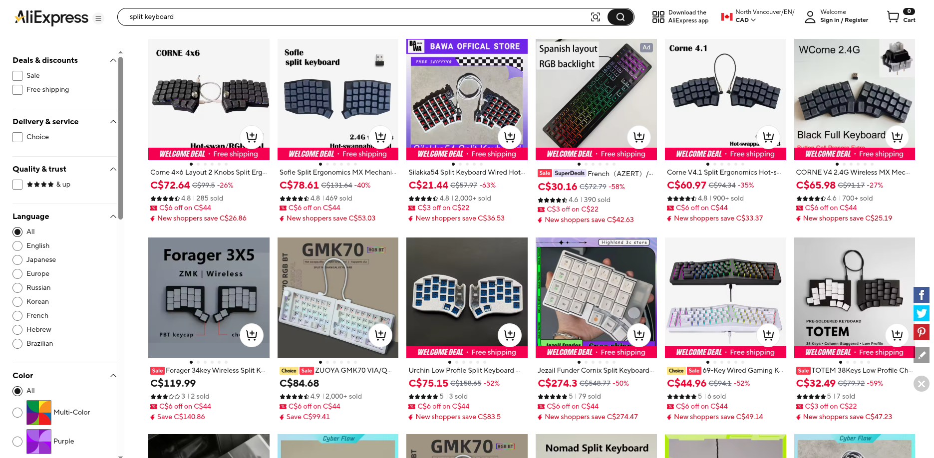 Aliexpress with many affordable options for split keyboards. (Source: Aliexpress)